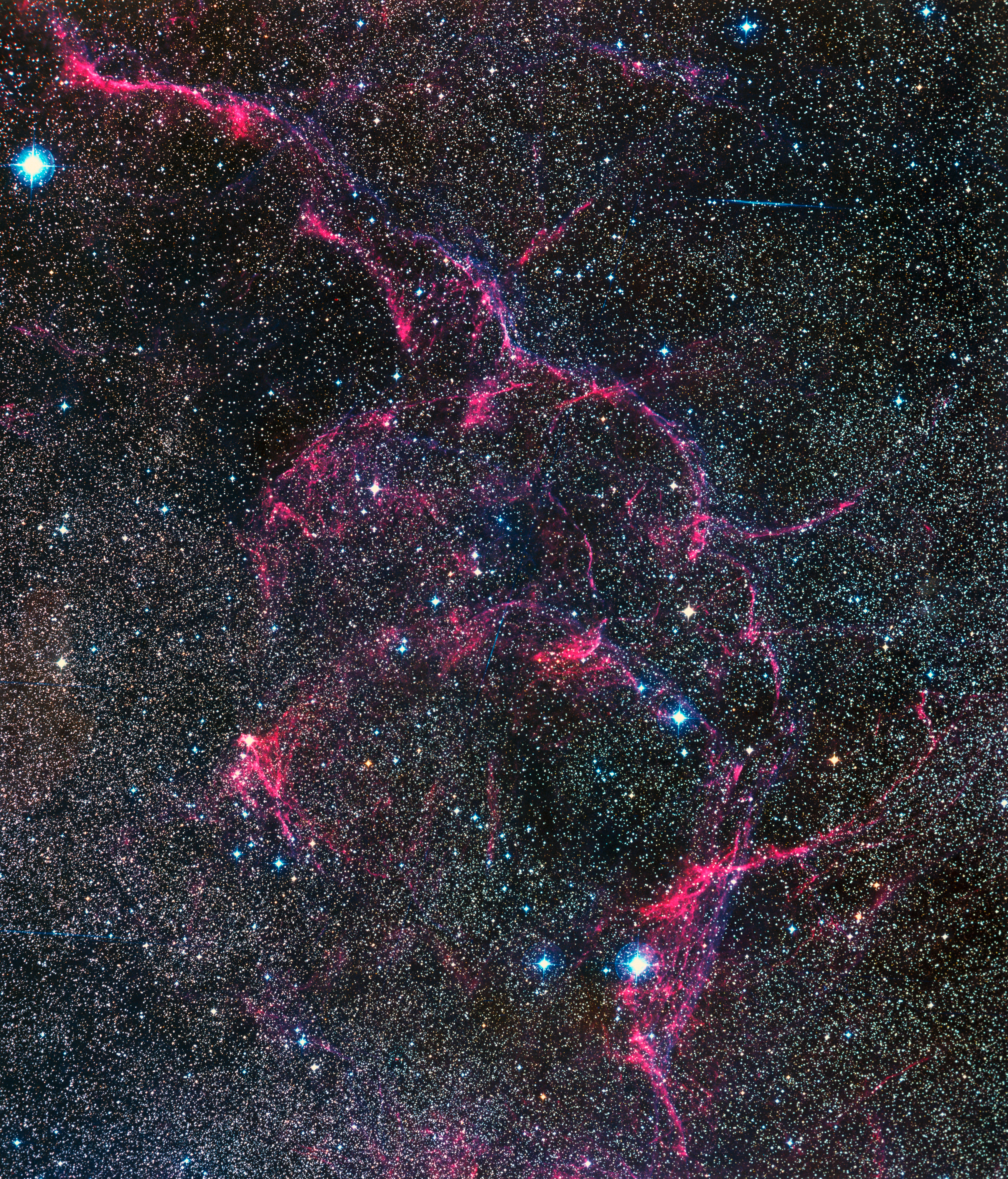 This beautiful image of the Vela Supernova Remnant (SNR) was taken by ESO's 1-meter Schmidt Telescope at La Silla in Chile. The glowing gas ribbons seen here are part of a shock wave launched into the interstellar medium by a large star that exploded about 11,000 years ago. A "ghost" of the once-large star remains: an ultra-dense neutron star that spins more than 10 times a second, called a pulsar, is located in the central region of this SNR.