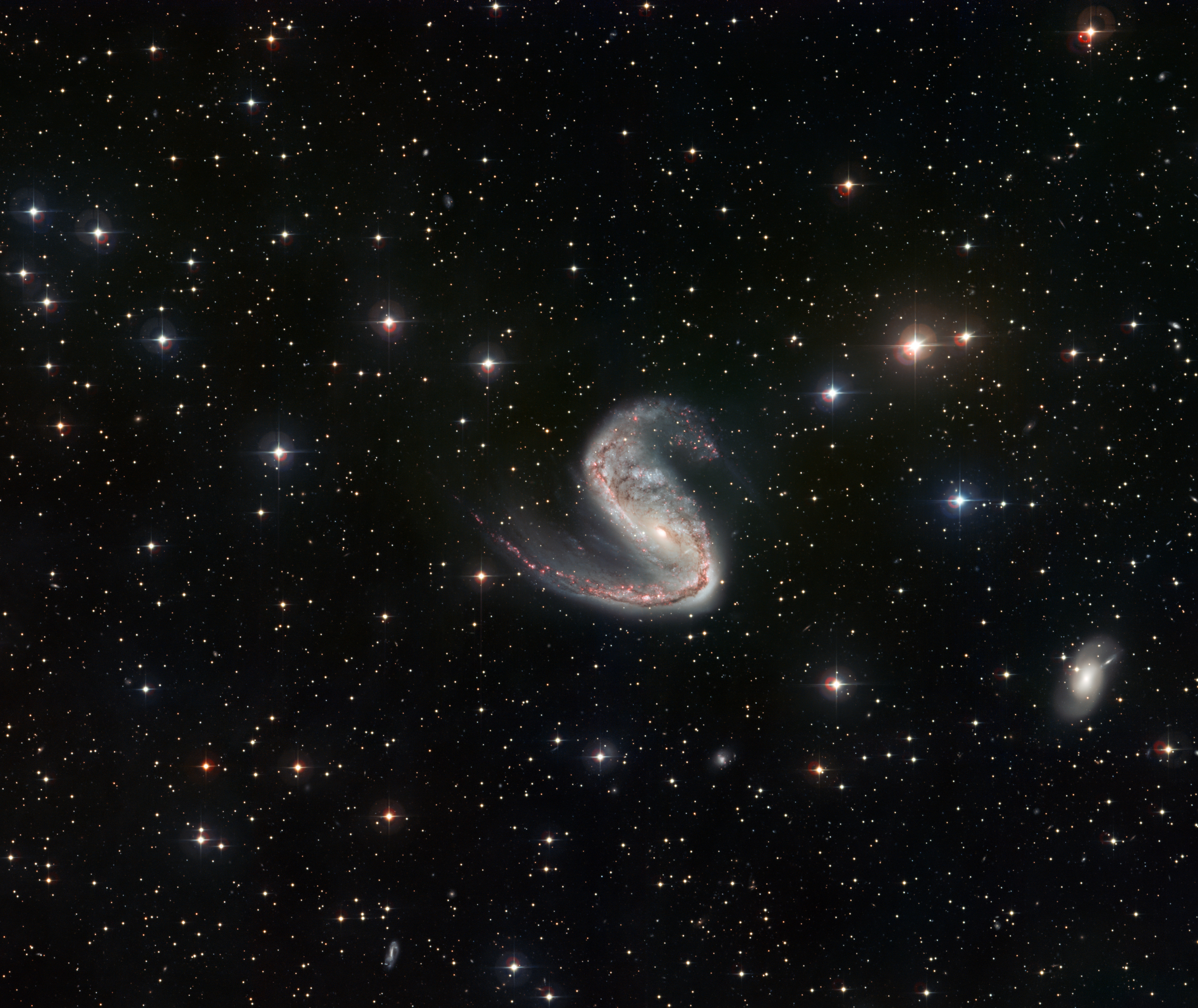 This picture of NGC 2442, the Meathook Galaxy, was taken by the Wide Field Imager on the MPG/ESO 2.2-meter telescope at La Silla, Chile. It shows a much broader view than the Hubble image, although less detailed. This view includes the whole galaxy and the surrounding sky, and clearly shows the asymmetric spiral arms. The longer of the two arms has intense star formation, which is visible here as a pink glow: this is due to the radiation of young stars ionising the gas they form from. The asymmetric shape and star formation are both thought to be caused by tidal disruptions from a near-miss with another galaxy at some point in its history.